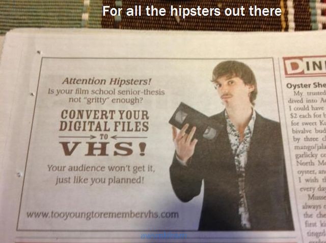 This entry was posted in laughs and tagged 9gag, aren't they yellower?, attention hipsters, backwards compatible, banksy, brown simpsons, buffet, classifieds, convert your digital files to vhs, don't eat meat?, funny picture, happy family, indian simpsons, is this real?, kinda dark, lamb chips, life preserver, lobster, mirrage, really.......worth preserving this one?, swimming with dolphin, swimming with the fishes, that's ok!, too much ear hair, tooyoungtoremembervhs, urban, urban simpsons, vandalism, vhs, we got lamb!, yellow. Bookmark the permalink.